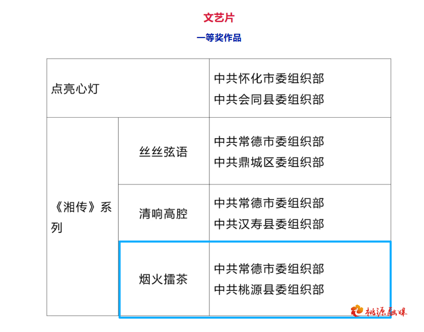 11月3日,红星云公示全省党员教育电视片观摩交流活动优秀作品名单,由常德市委组织部、桃源县委组织部联合拍摄的党员教育片《烟火擂茶》荣获全省文艺类视频一等奖。