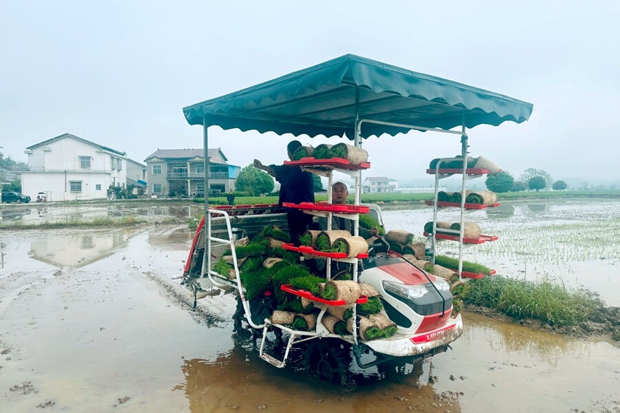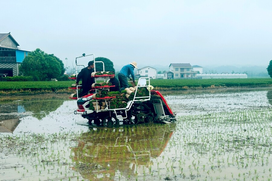 伴随着机器的轰鸣声,插秧机在泥泞的水田中来回穿梭,机械臂起起落落,一株株嫩绿的秧苗被精准、快速地植入泥土中。