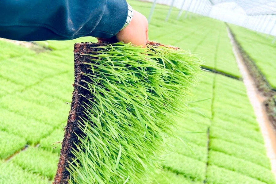 在标准化的育秧大棚内,一排排秧盘整齐划一,如绿色的地毯般铺陈开来。